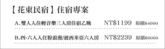 商品訊息簡述: 只要1199元起即可享【花東民宿】原價最高6000元住宿專案:(A)雙人入住輕音樂三人房住宿乙晚/(B)外六人入住粉浪漫/波西米亞六人房。